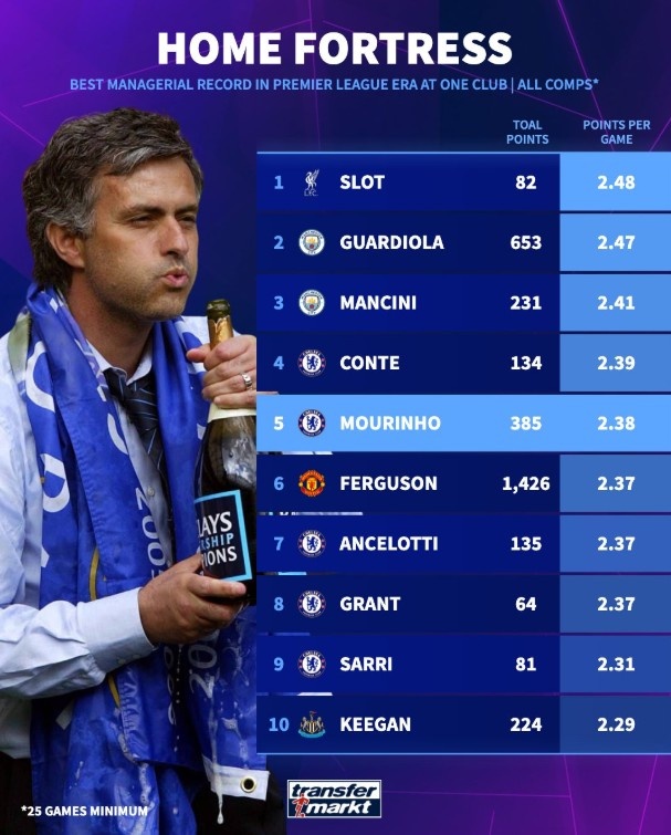 英超执教单一球队主场场均得分榜:斯洛特第一,瓜帅第二穆帅第五