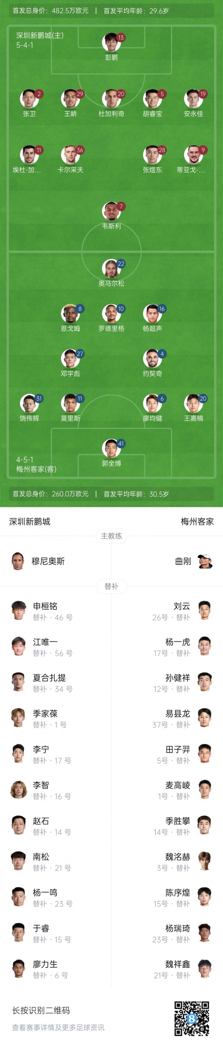 08月31日讯 北京时间19:35,中超第23轮,深圳新鹏城主场对阵梅州客家。赛前,双方首发出炉。